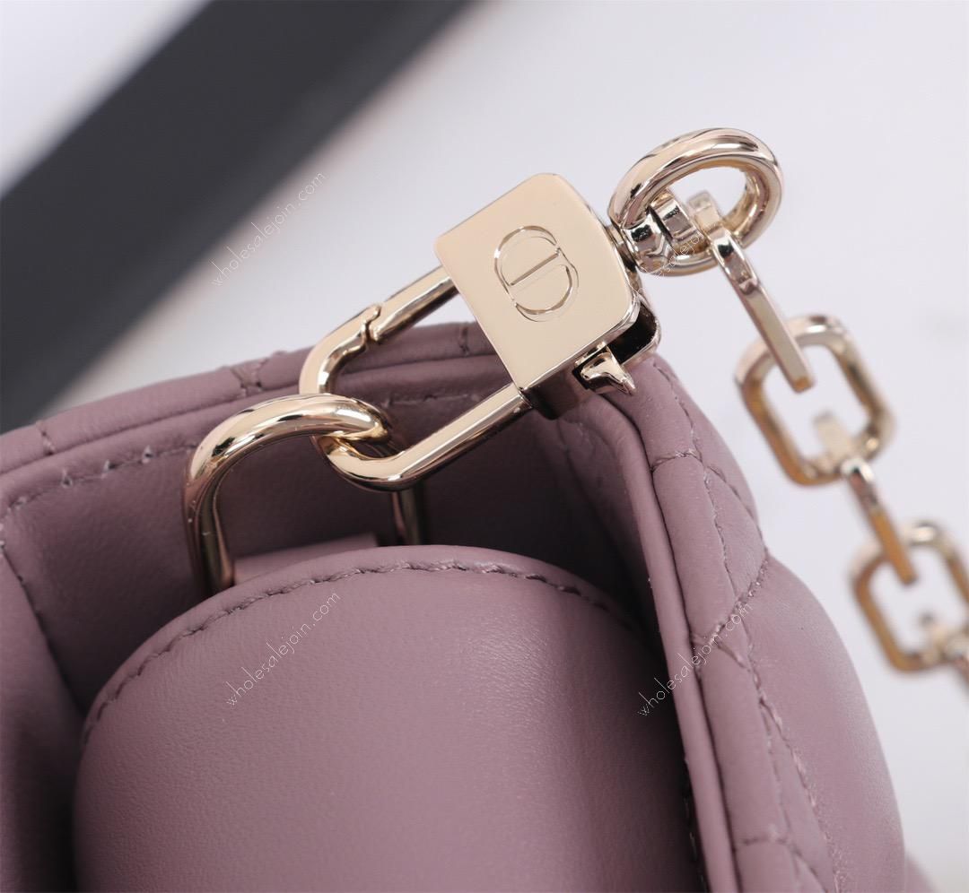 he bag epitomizes the collection's minimalist aesthetic, epitomizing a profound vision of elegance and beauty. Crafted in peony pink lambskin leather with cannage stitching, it is enhanced with a light gold-finish metal charm that adds a touch of agility to the delicate silhouette. The small version is available with a detachable chain shoulder strap and an adjustable and detachable leather shoulder strap, making it an ideal choice for everyday wear, whether by hand, on the shoulder or across the body. Detachable chain shoulder strap, detachable and adjustable leather shoulder strap.