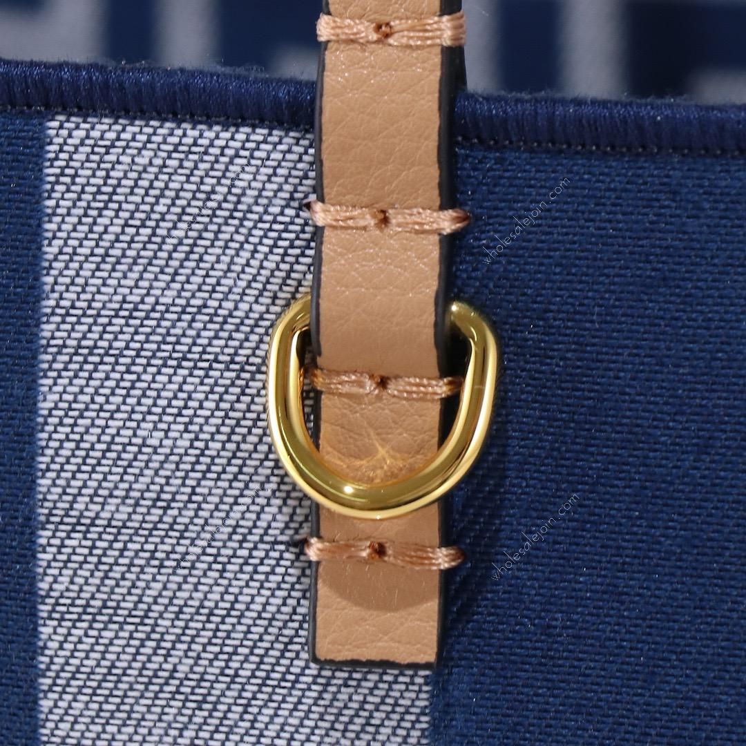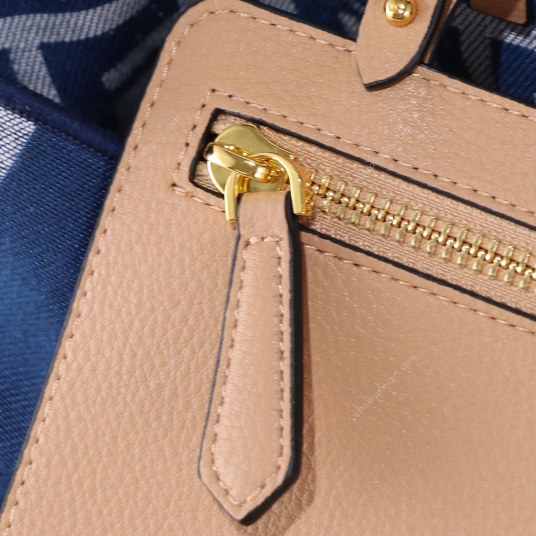 A classic tote that combines practicality with refined details. Double-sided in jacquard fabric, with stripes on one side and the iconic pattern on the other. Removable leather zip pocket and gold-finish hardware. Leather handles for hand or shoulder carry, decorated with hand-stitching.