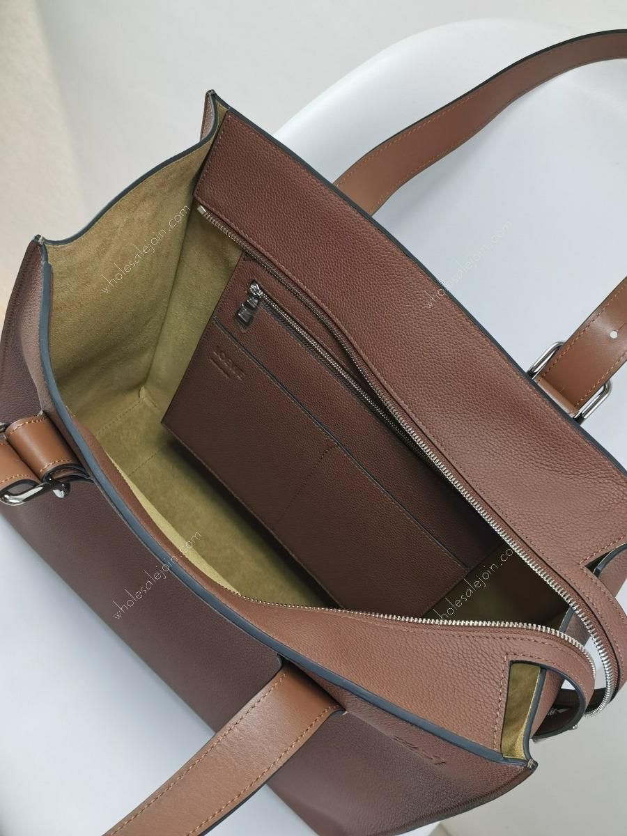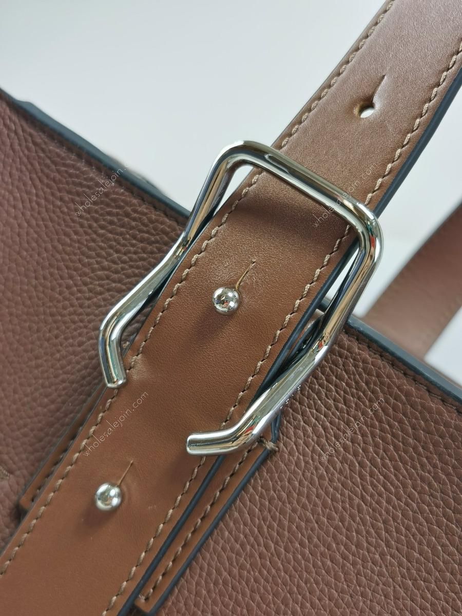 Large capacity and slim silhouette. Flat and asymmetrical double top handles, decorated with the iconic curved opening buckle, can be adjusted with a chain buckle for different carrying methods. Main features: wide flat rectangular body, internal zip pocket, two stitched pocket compartments, leather lining, embossed embellishment。