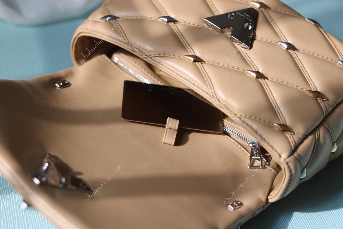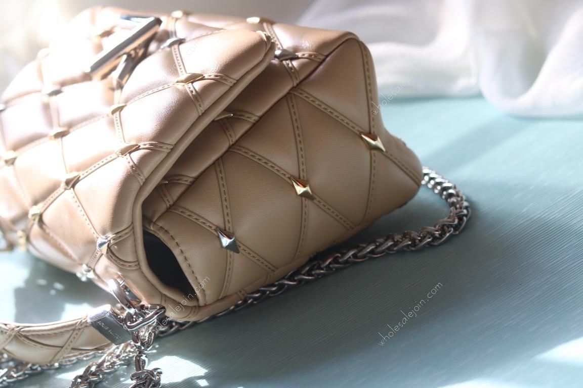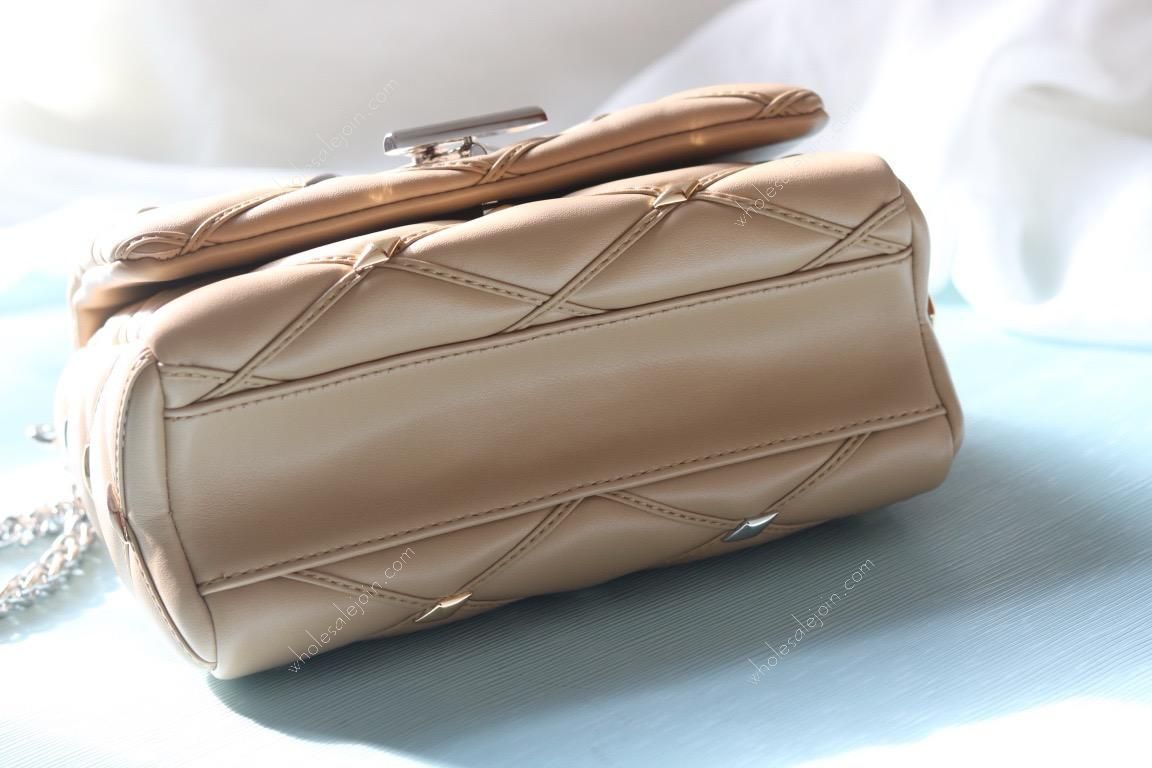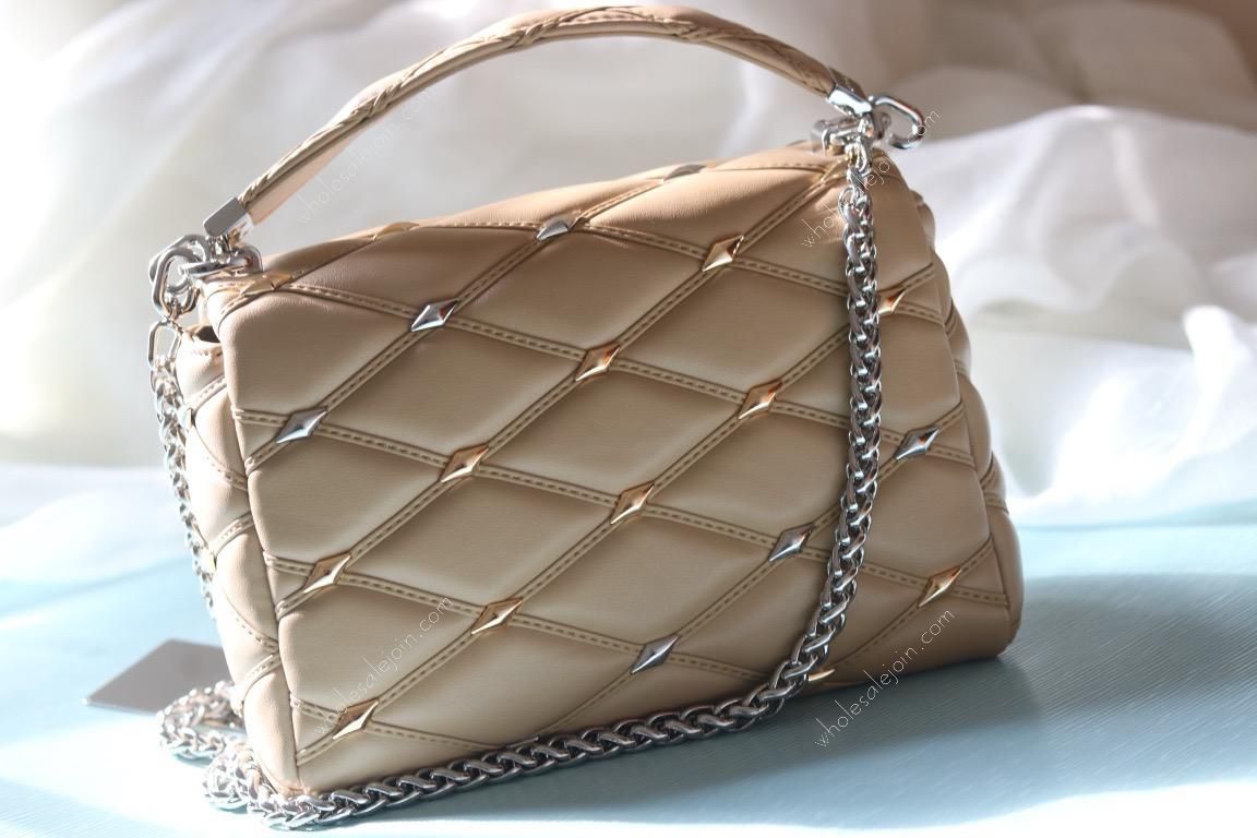 The handbag is made of diamond-grained sheepskin with shiny diamond studs and a hard case quilted lining design. The rolled leather handle and detachable and adjustable shoulder strap provide comfortable carrying.