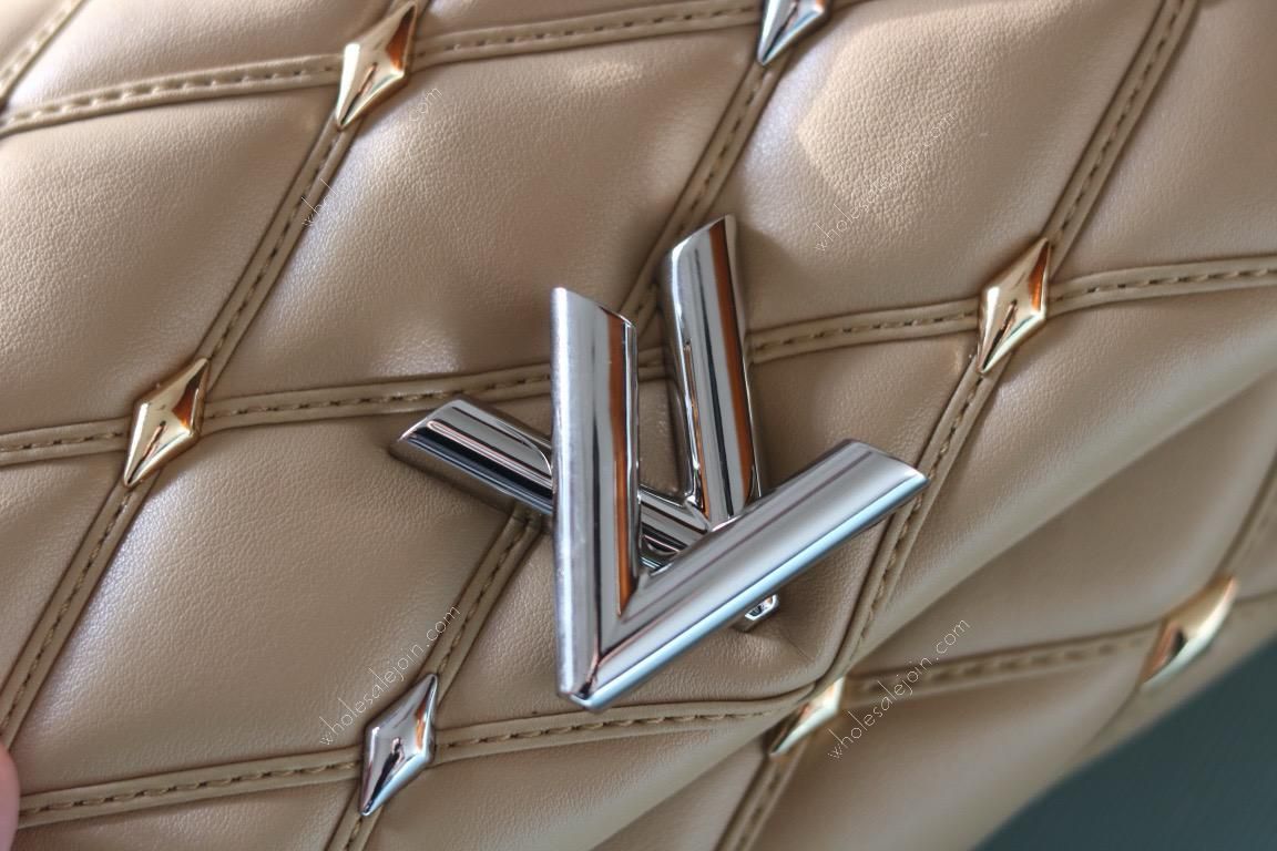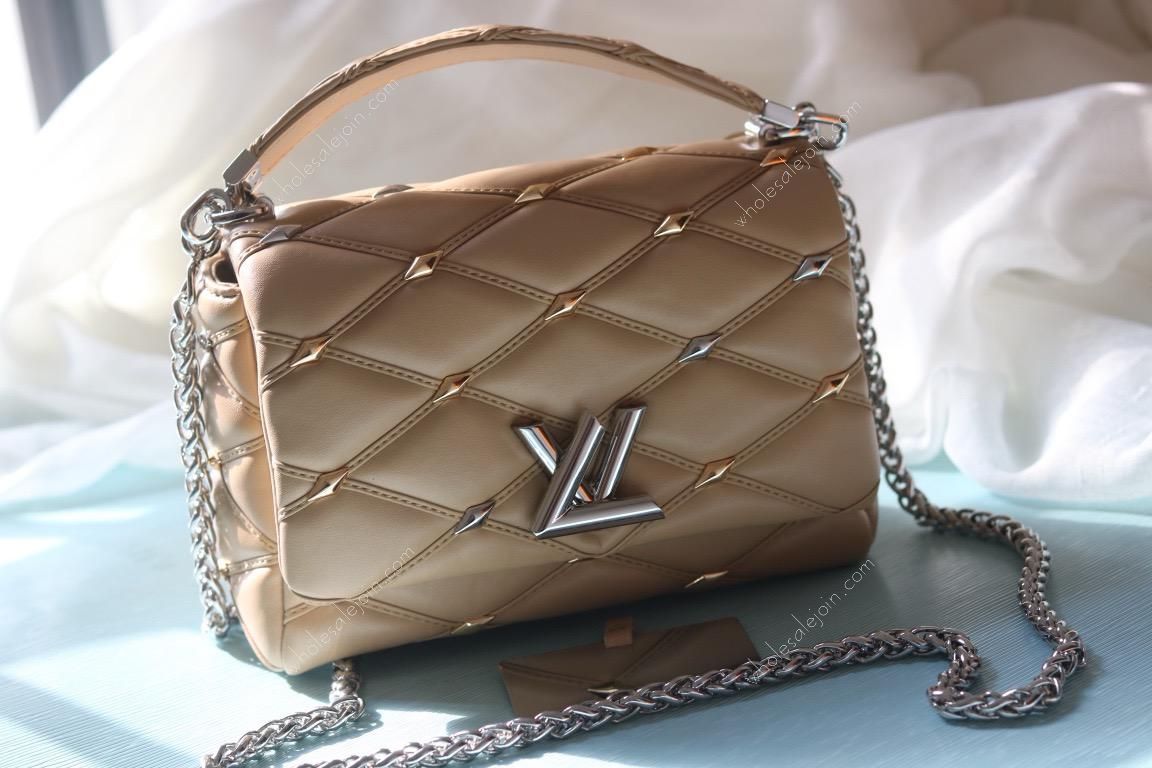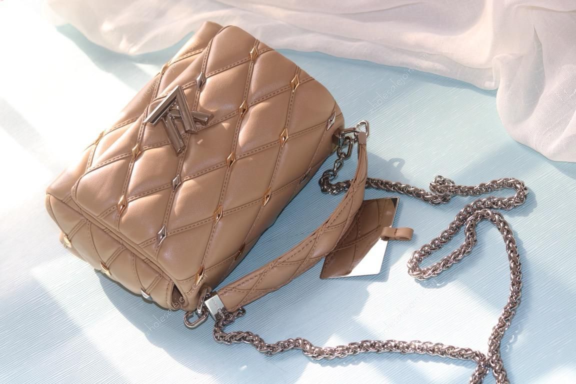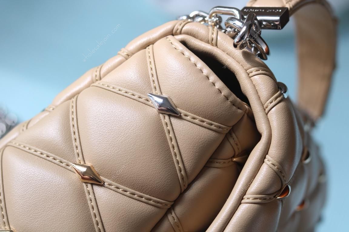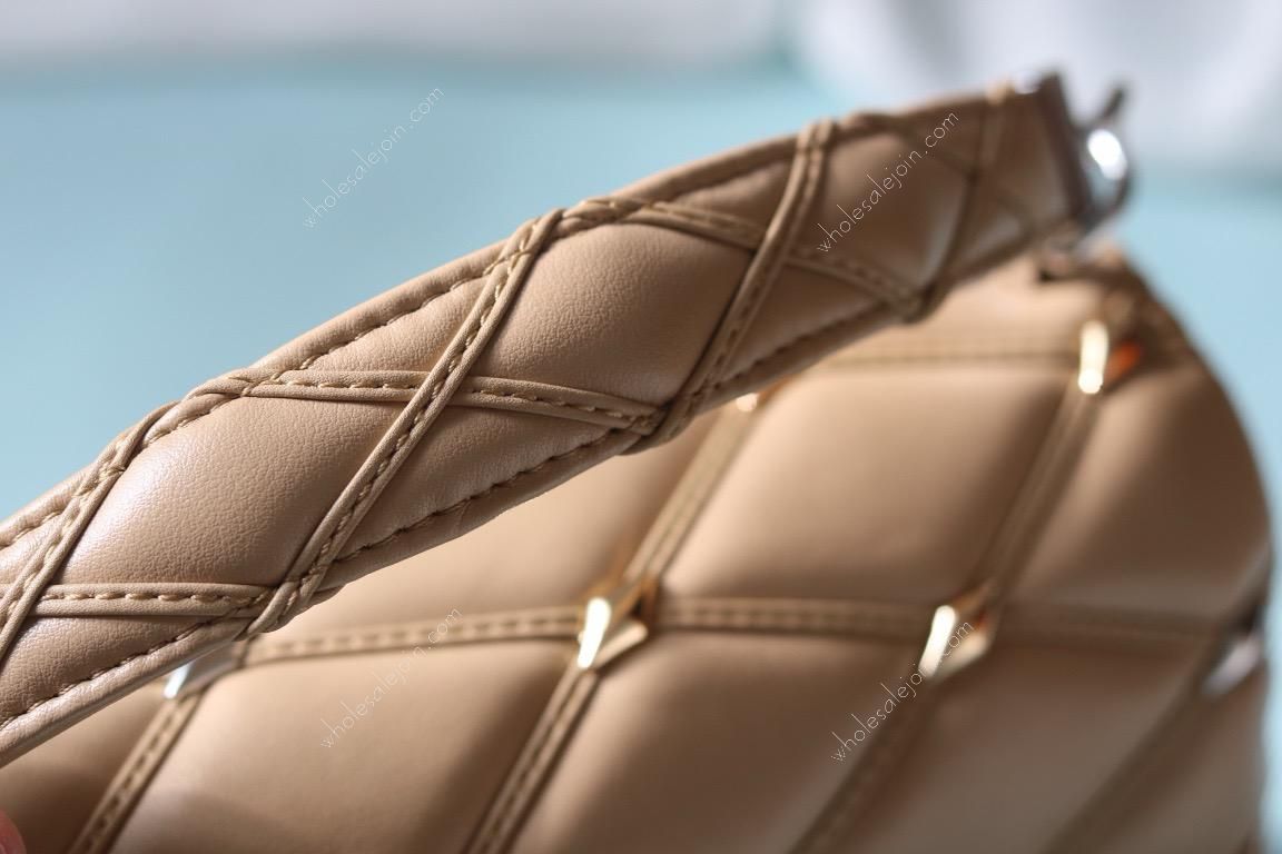 The handbag is made of diamond-grained sheepskin with shiny diamond studs and a hard case quilted lining design. The rolled leather handle and detachable and adjustable shoulder strap provide comfortable carrying.