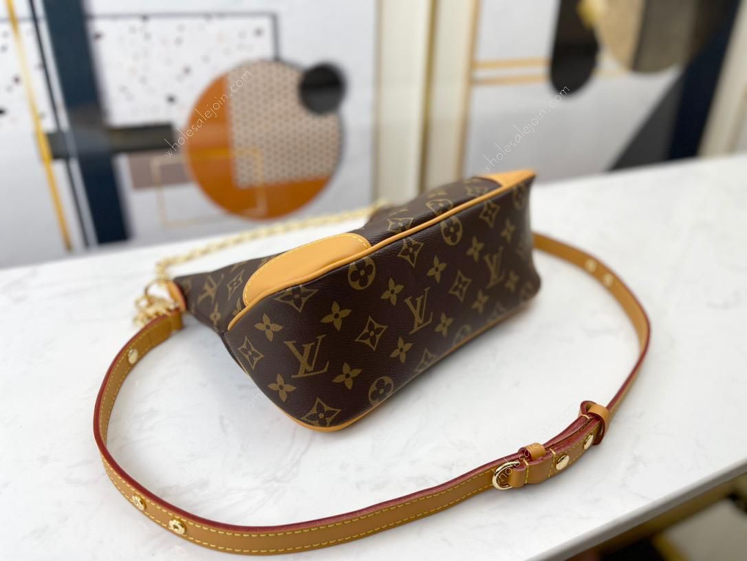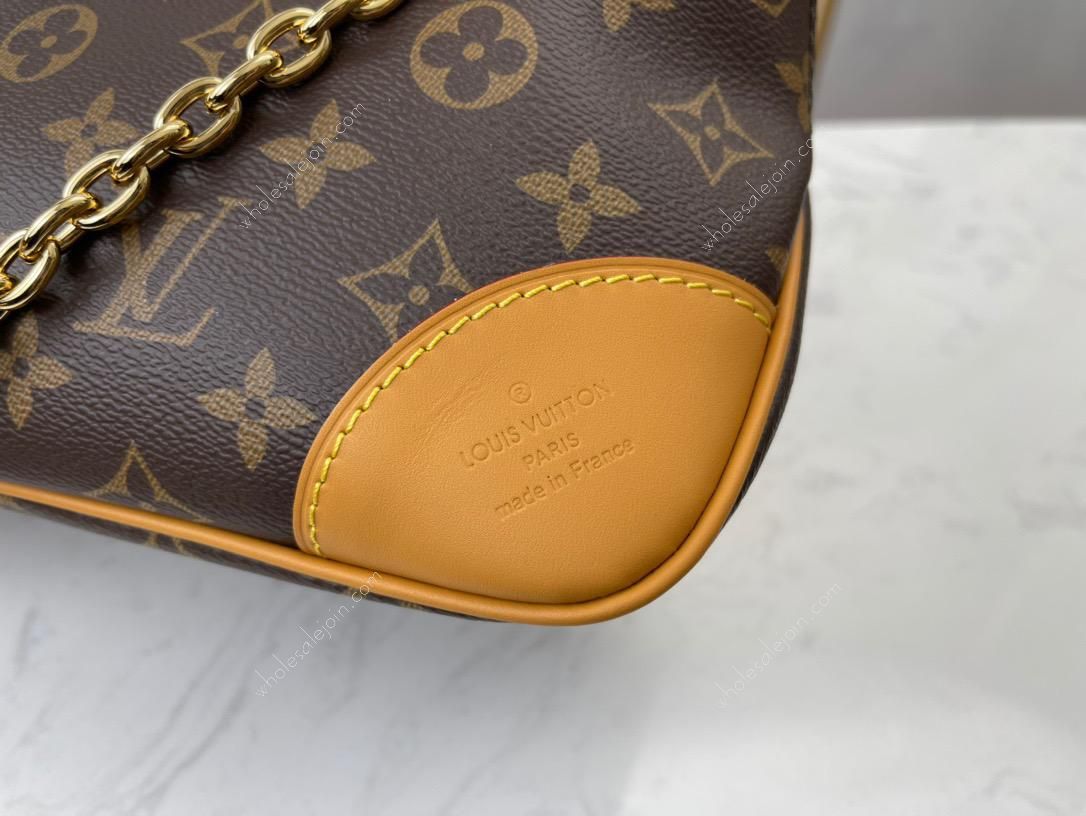 The small handbag with monogram and yellow leather conveys a retro feel with canvas and reinforced leather corners. The adjustable shoulder strap is convenient for shoulder or crossbody, monogram with leather chain shoulder strap, semi-circular bag, curved bag, pea bag, and you can take out the accompanying items by lightly opening the zipper.
