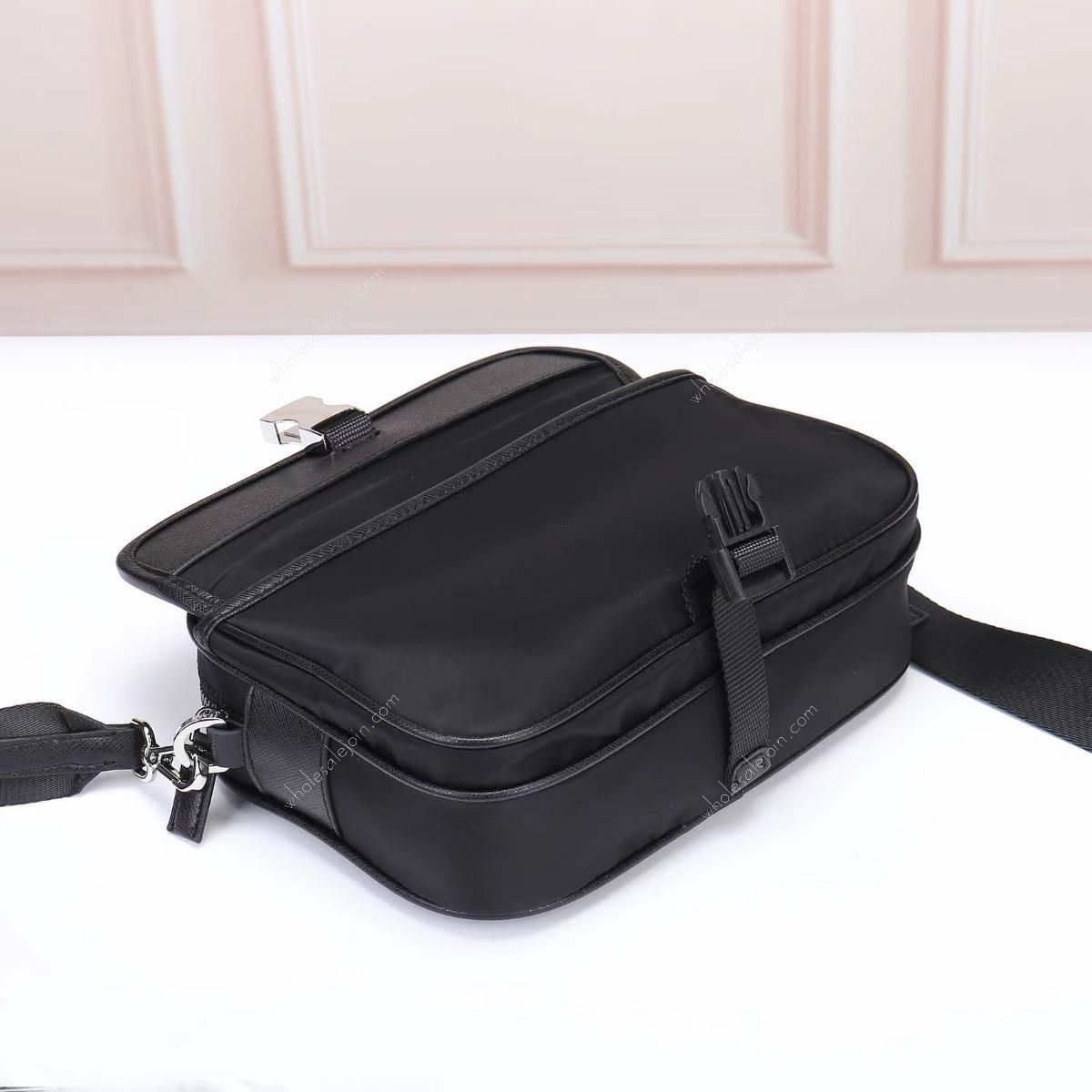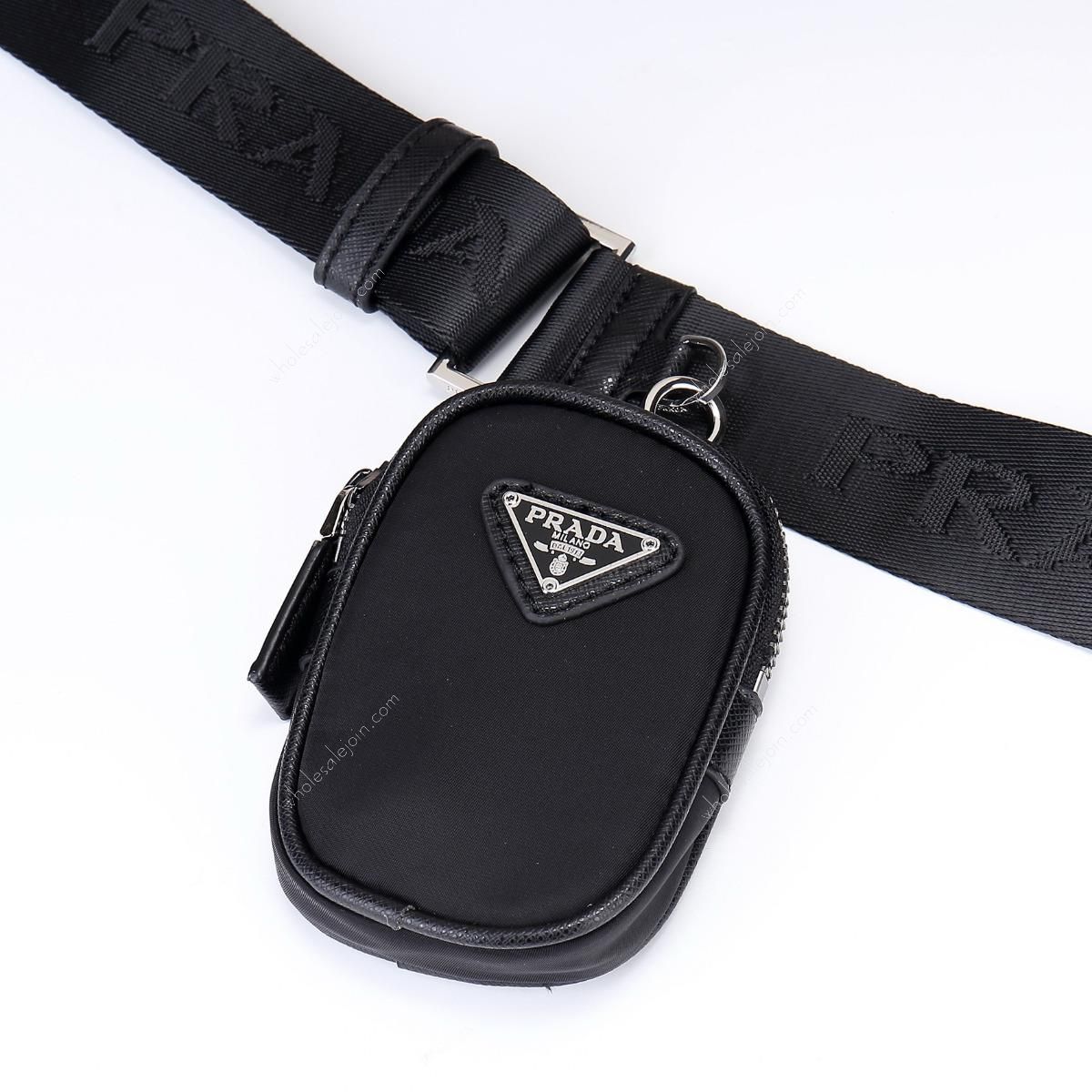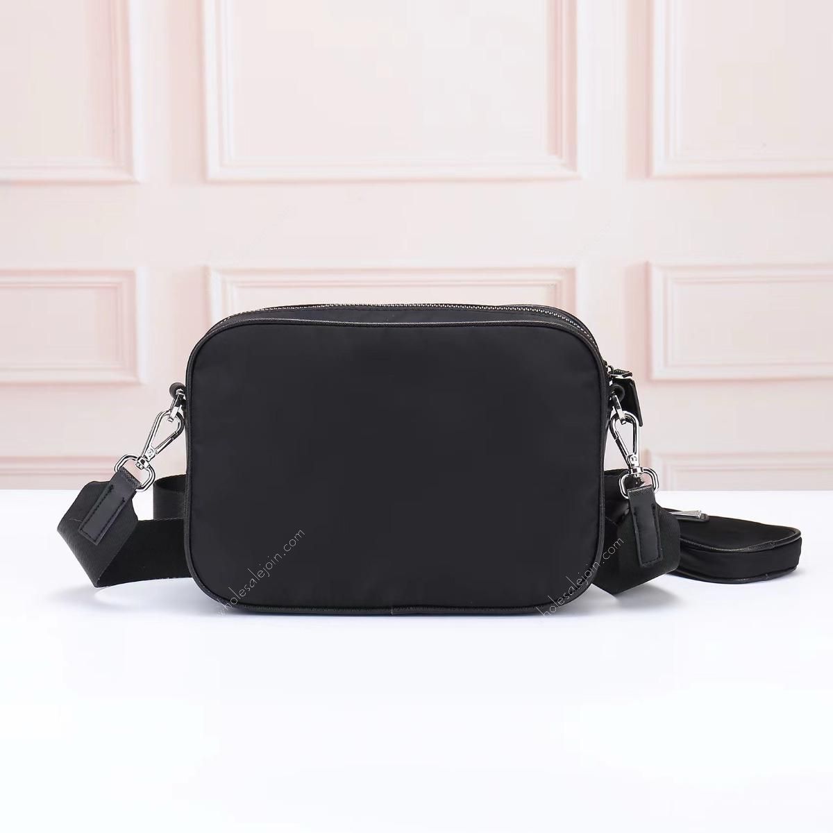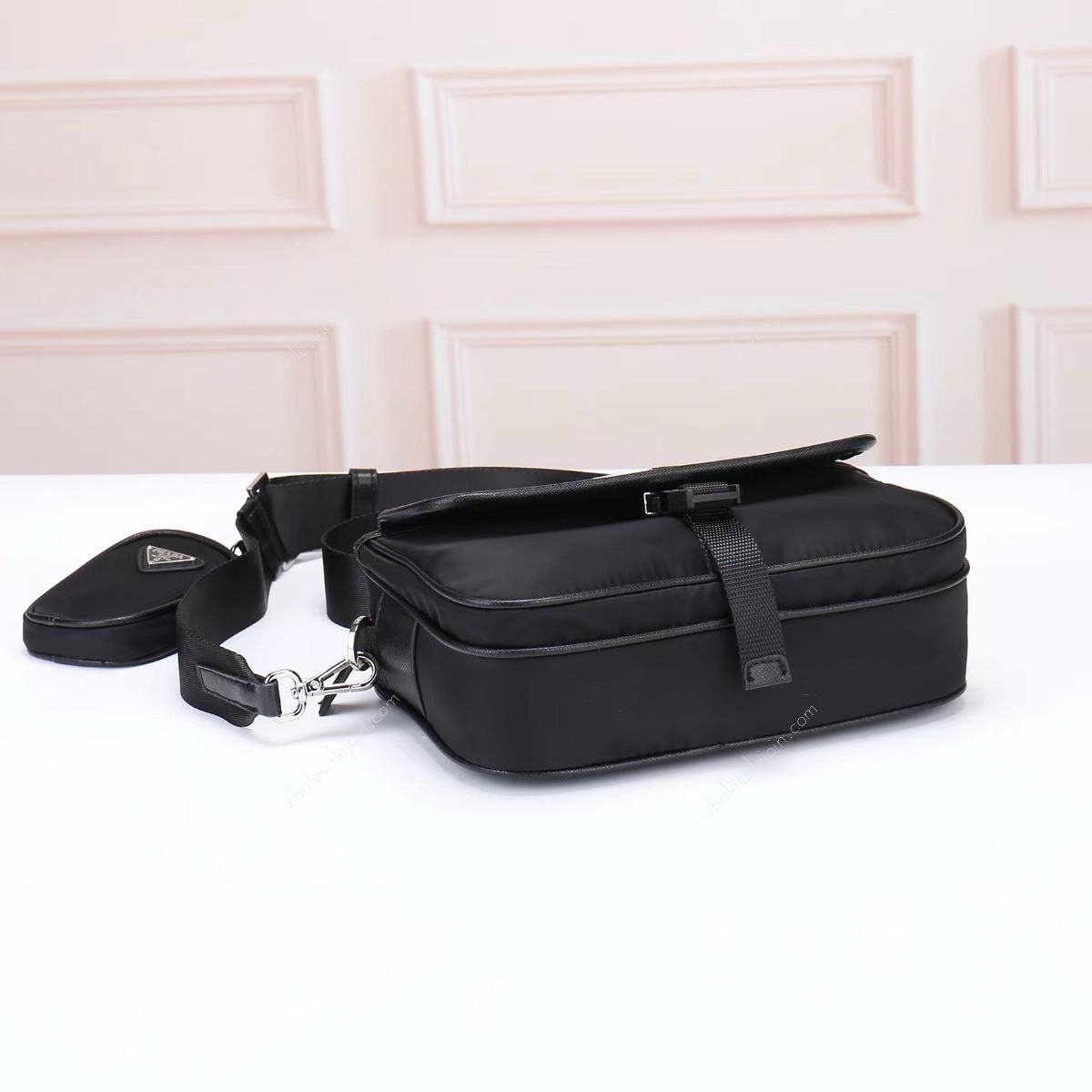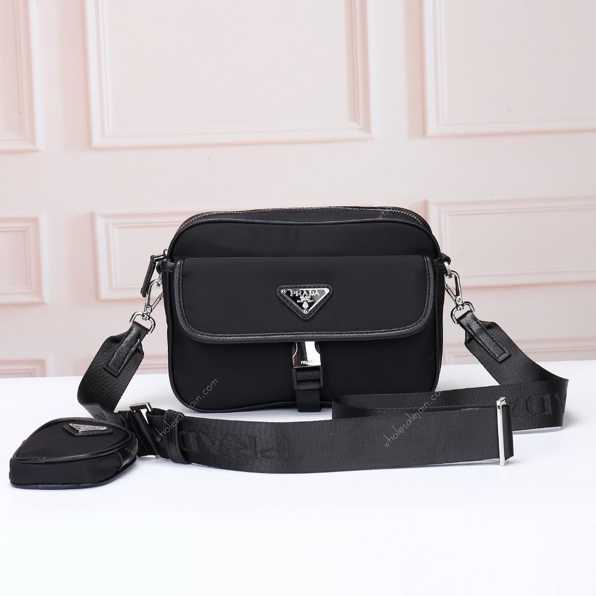 Crossbody bag made of imported nylon fabric, top-grade hardware, detachable and adjustable nylon strap and leather shoulder strap, with detachable pouch, enameled metal triangle logo on flap Zipper closure, external pocket, with flap and side buckle, recycled worded nylon lining, lightweight and practical.
